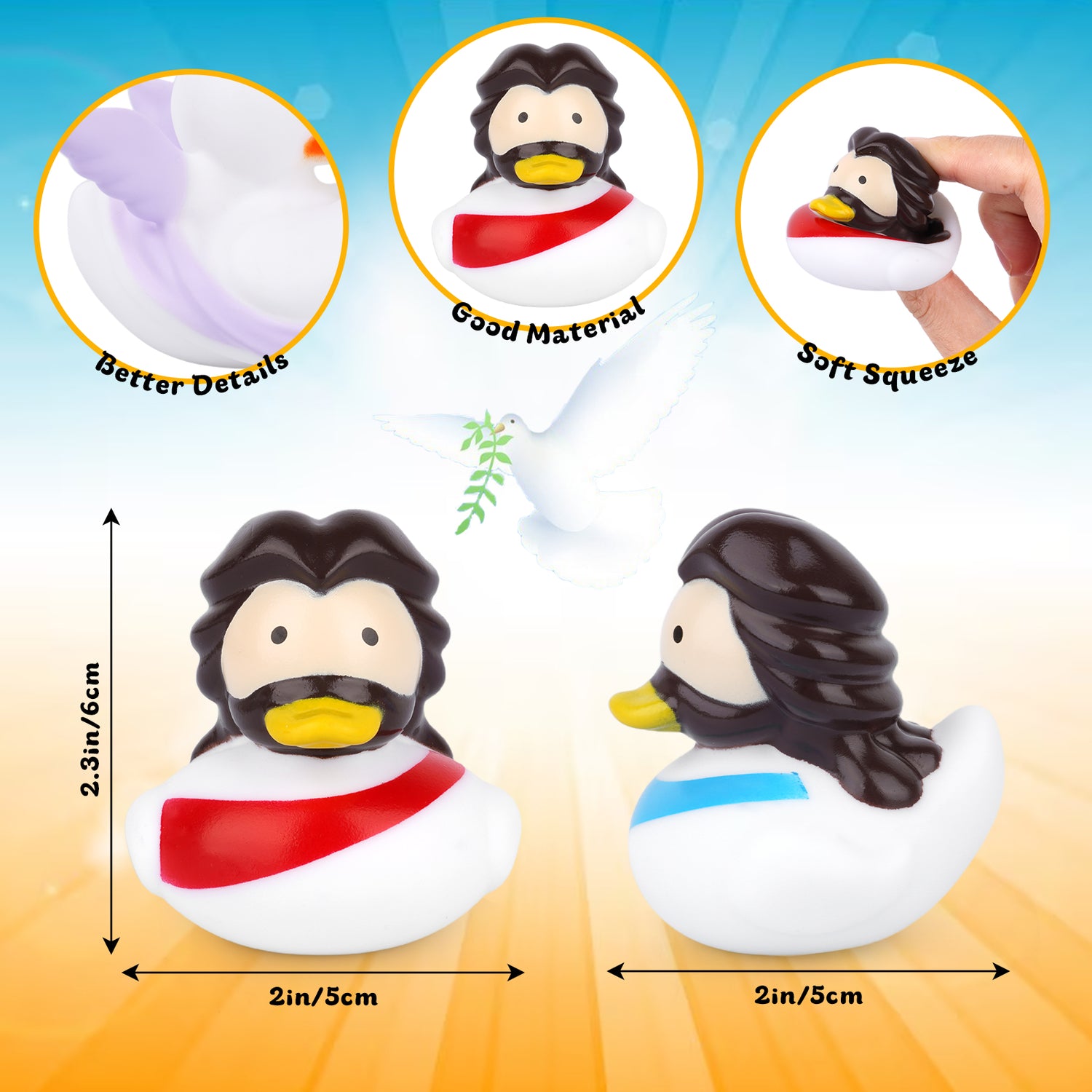 • Jesus Party Supply: Tell the story of Jesus to your child with fun and lively Jesus rubber duckies. Tells the story of what happened to these animals with Jesus. Use as a role play educational toy. Ideal for home, school, community, church, baptism party supplies and Christian gifts.