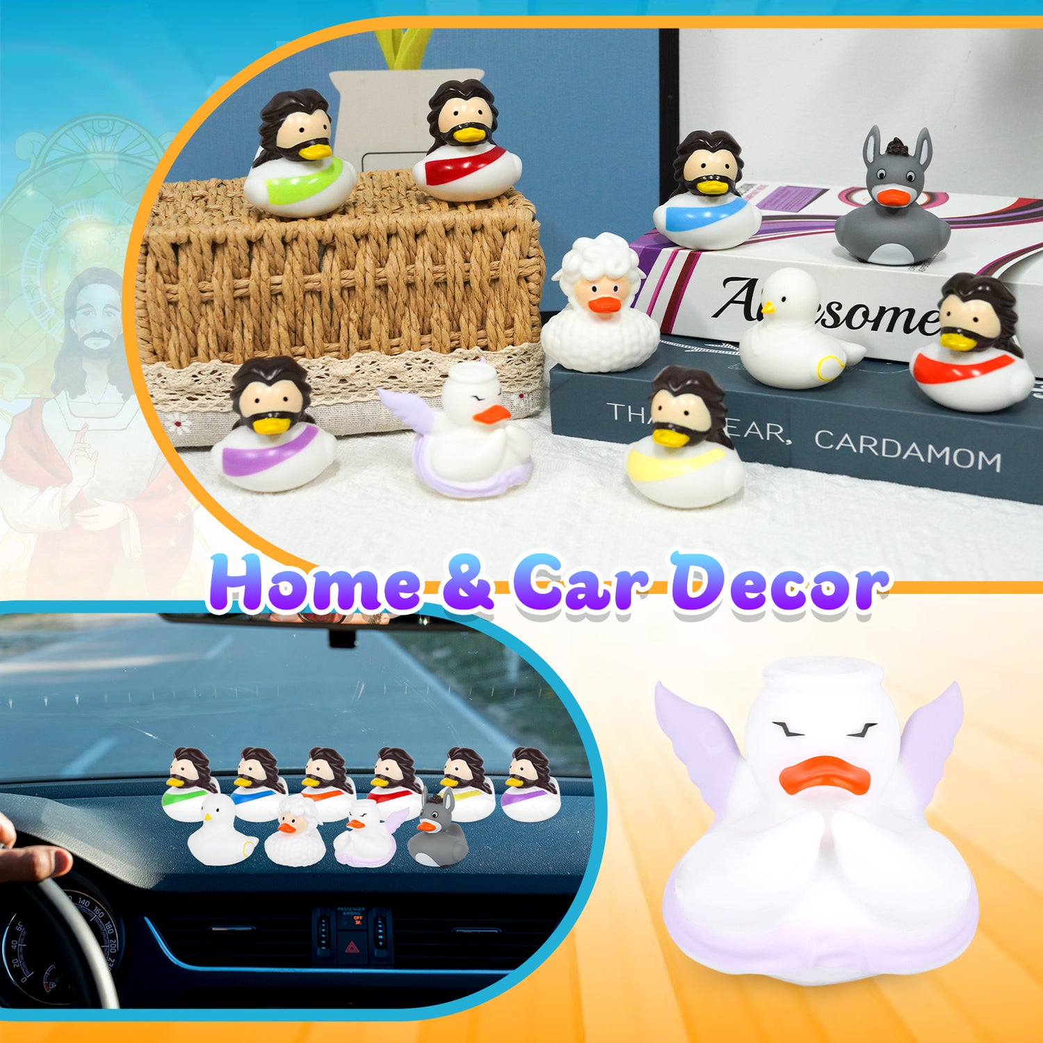 • Innovative Ducks: these little rubber duckies incorporate a Jesus-inspired design that is a collision of classic and innovation. Available in 6 colors: red, orange, yellow, green, blue and purple. The fun and delicate ducks are sure to capture the eyes and hearts of your duck lovers.