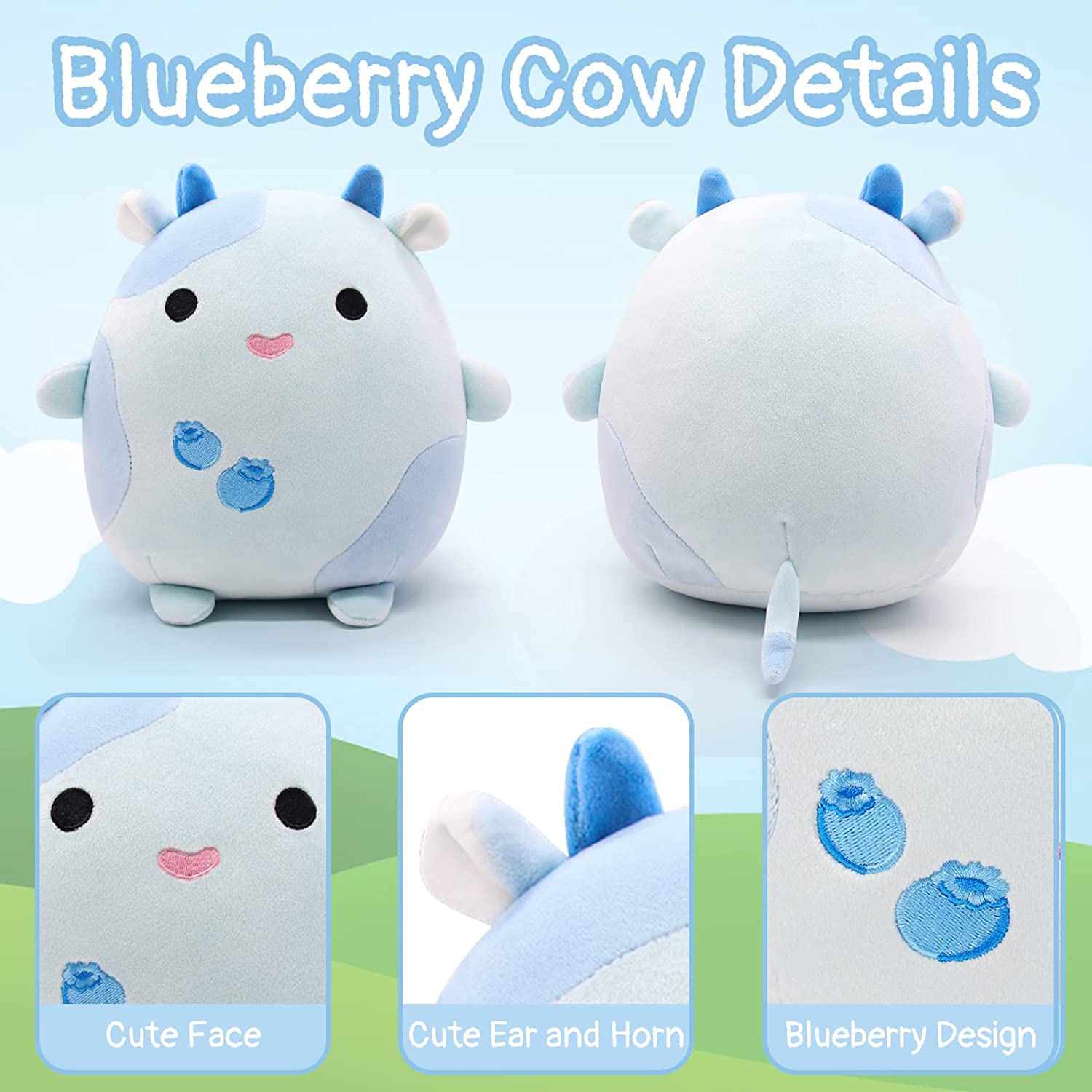 【Perfect Surprise Gift】: Children of all ages will love this kawaii stuffed blueberry cow Plush toys,the perfect size for playing.Suitable decorate for bedroom,living room,family,office,car etc.You can also give it to family,friends,sons, daughters,toddlers holiday gifts.