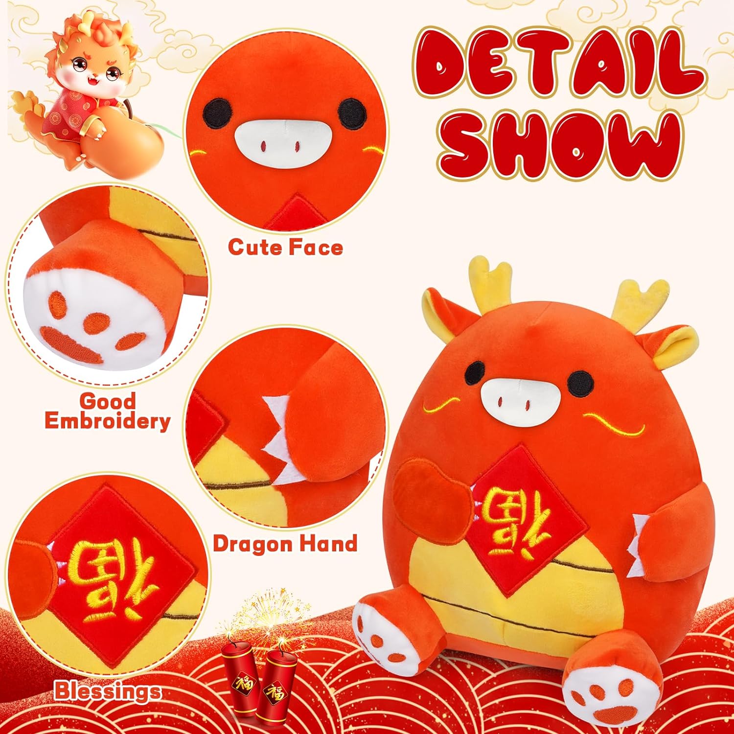 - Chinese New Year Decoration 2024: Decorate your home with dragon plush representing good luck and prosperity. Made of soft and fluffy material, these plush toys usually feature bright colors and delicate embroidery and are safe for children.