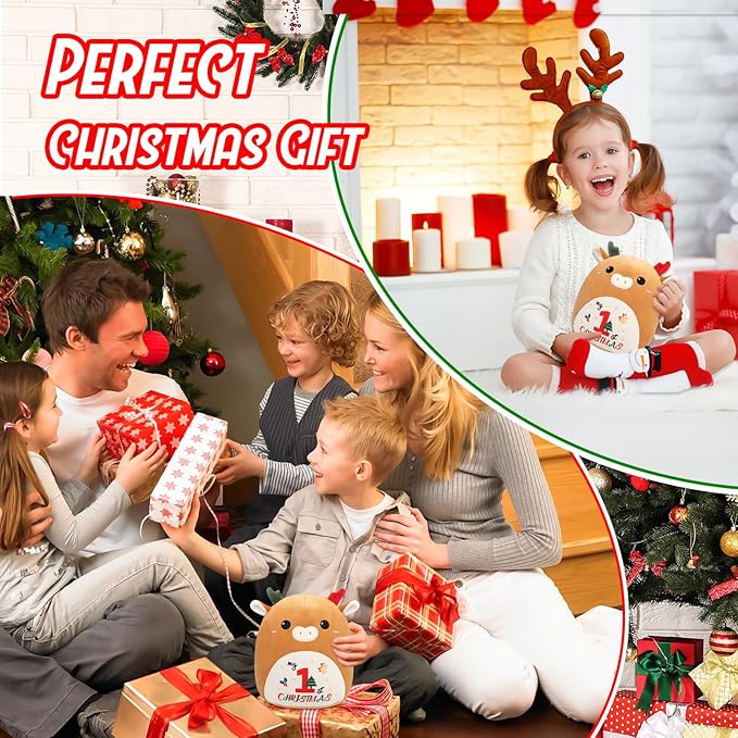 - Super Cute Christmas Plushies: Christmas elk plush full of rich elements. Red and green antlers and cute face with “My First Christmas” printed on the body, bells, Christmas tree, mistletoe. It is the perfect Christmas plush toy