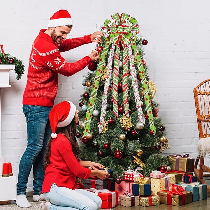 - INCLUSIVE PACKAGE: Receive a stunning tree topper bow measuring 53 X 13 Inches, adorned with a red and green polka dot pattern, perfect for elevating your Christmas tree decorations