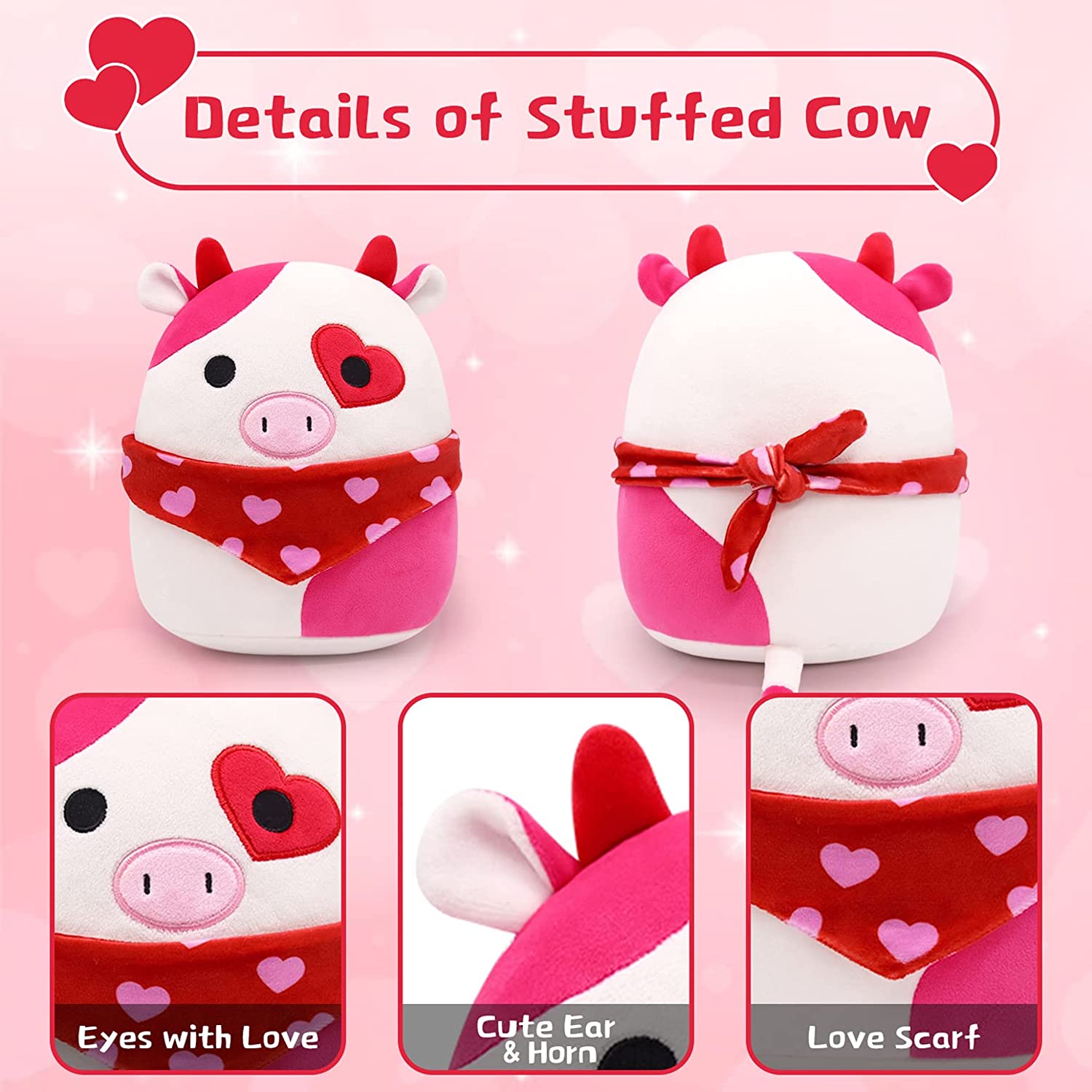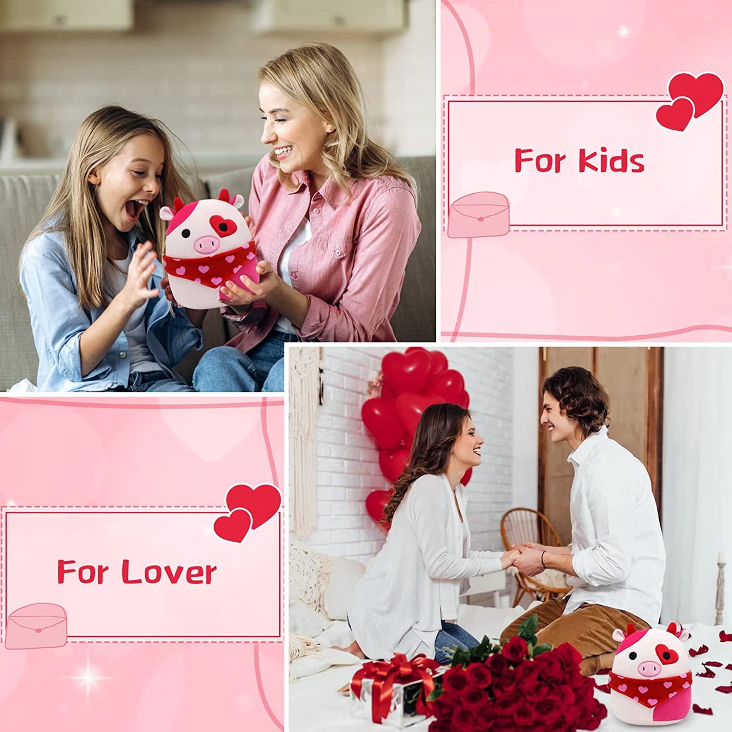 💖【Cute Cow Plush Can Express Love】: This plush cow toy is very cute and handsome, it comes with a red love scarf and eyes designed in the shape of a love heart to express your love for others. It is not only a plush toy, but also a symbol of love.