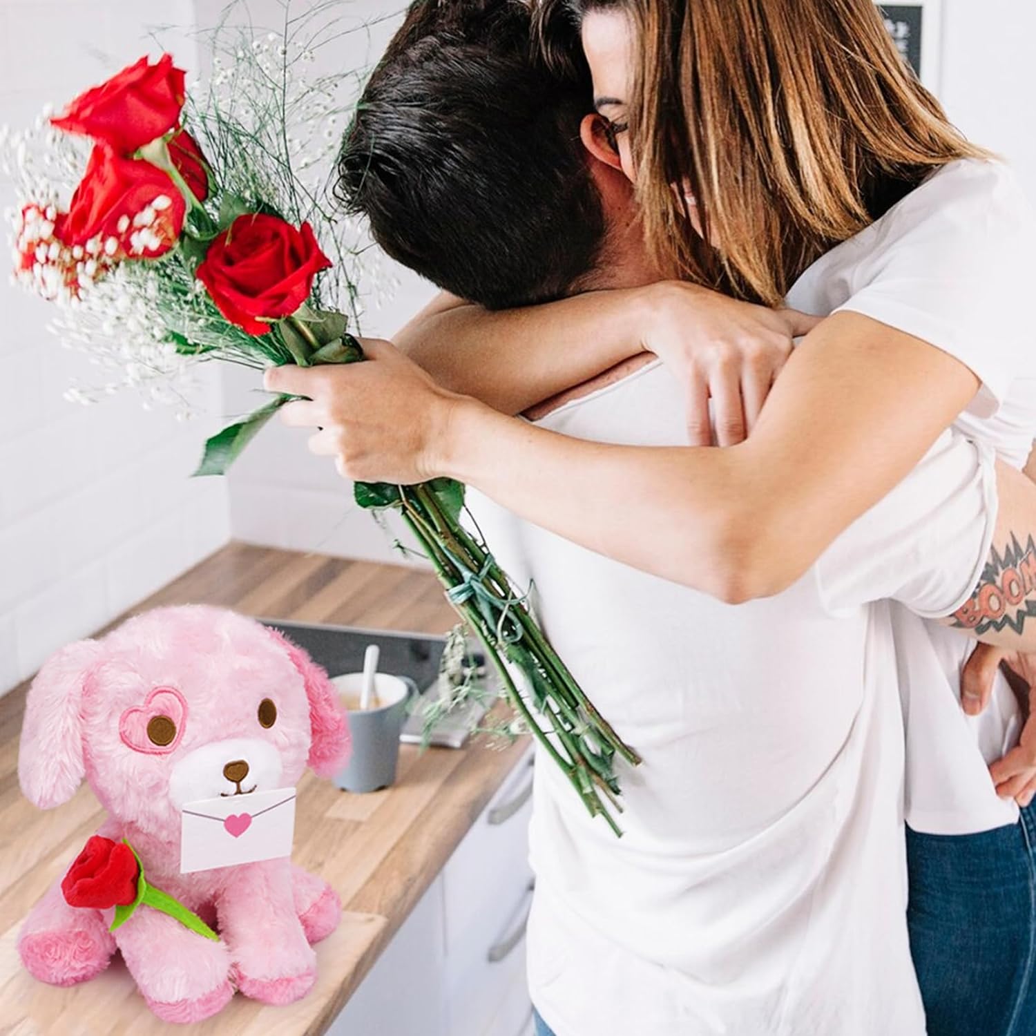 - Valentine's Day Gift: This adorable pink dog plush toy With a love letter in his mouth. It's a love letter to your lover. There's no one who doesn't love a cute and soft pink dog plush doll. This soft and cuddly dog stuffed animal toy is the perfect Valentine's Day gift for kids and family.