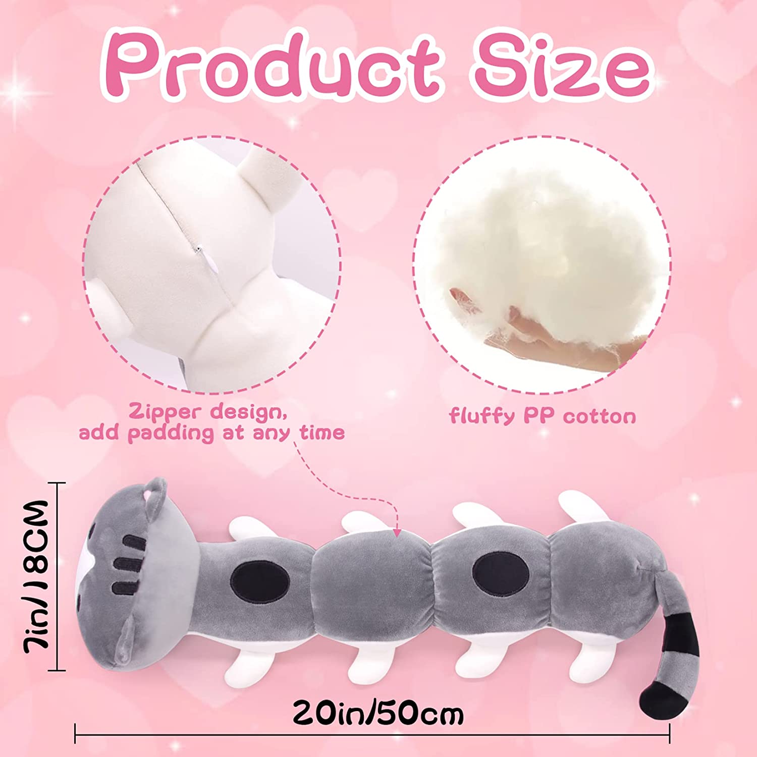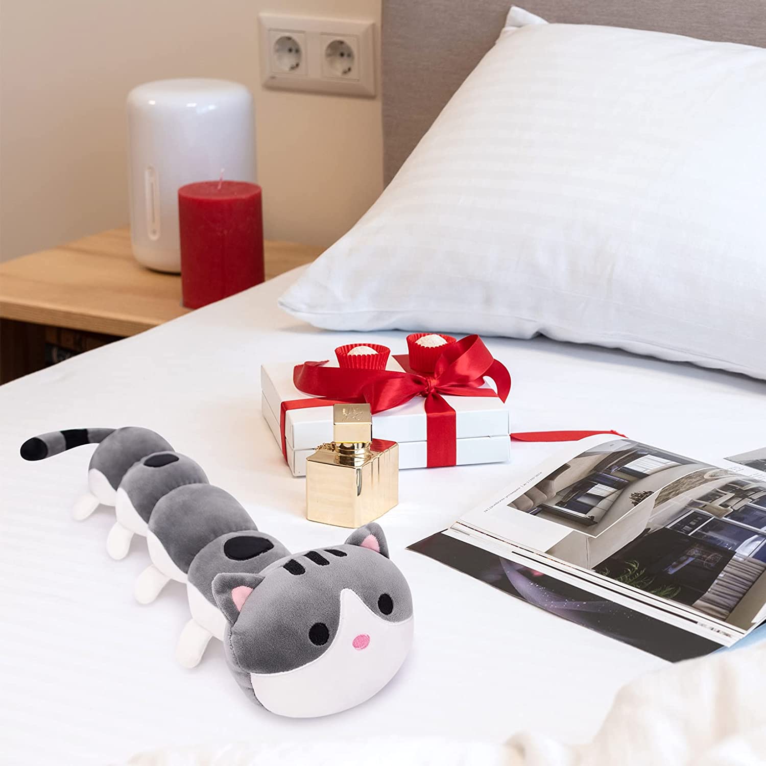 - [Vacuum Packed Cat Plush]: Plush cat pillow size is80 x 18CM, the right size is perfect for kids to play and hug him. Note: Vacuum packed plush dolls may need to be left for 1-2 days or put in the dryer to recover, please be patient.