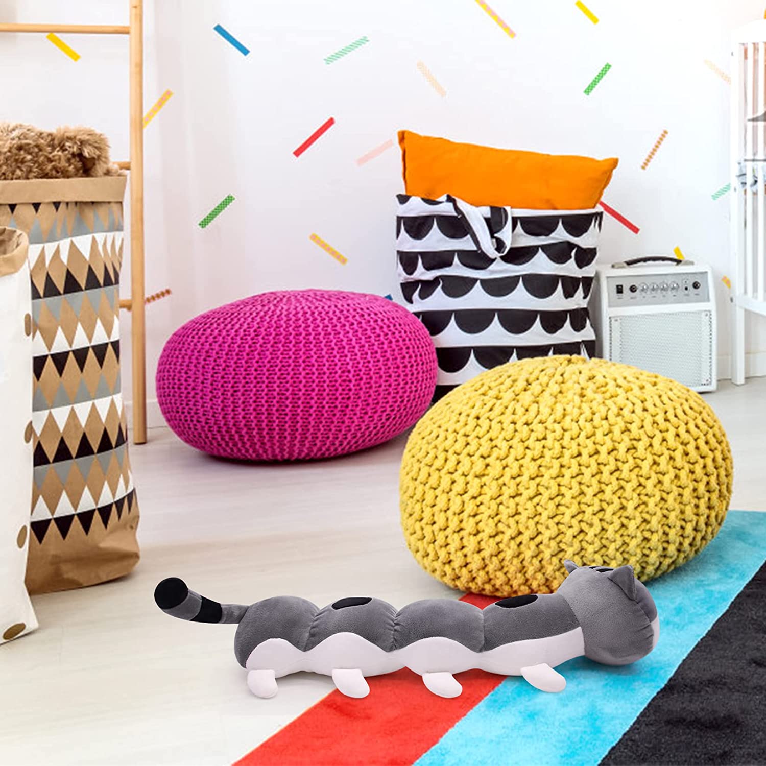 - [Cat Plush Pillow]: This long cat plush pillow is made of a variety of color block stitching, delicate embroidery so the plush cat can look very vivid and cute. Very unique shape design, children will like so kawaii it, as a friend of children, he can accompany the children to play.
