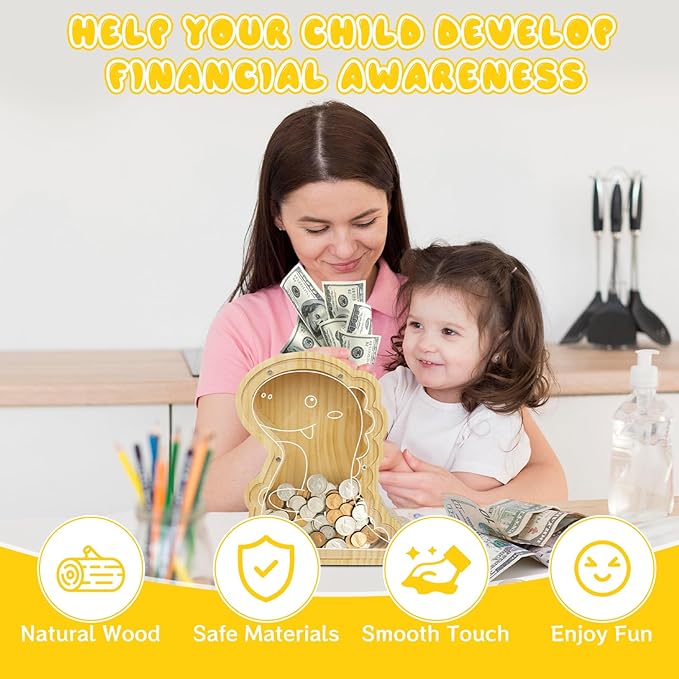 - Wooden Money Box:This sturdy money saving box is made of natural pine wood and acrylic material.The wooden dinosaur piggy bank is very sturdy and will not be broken by a child's drop and can be used for a long time