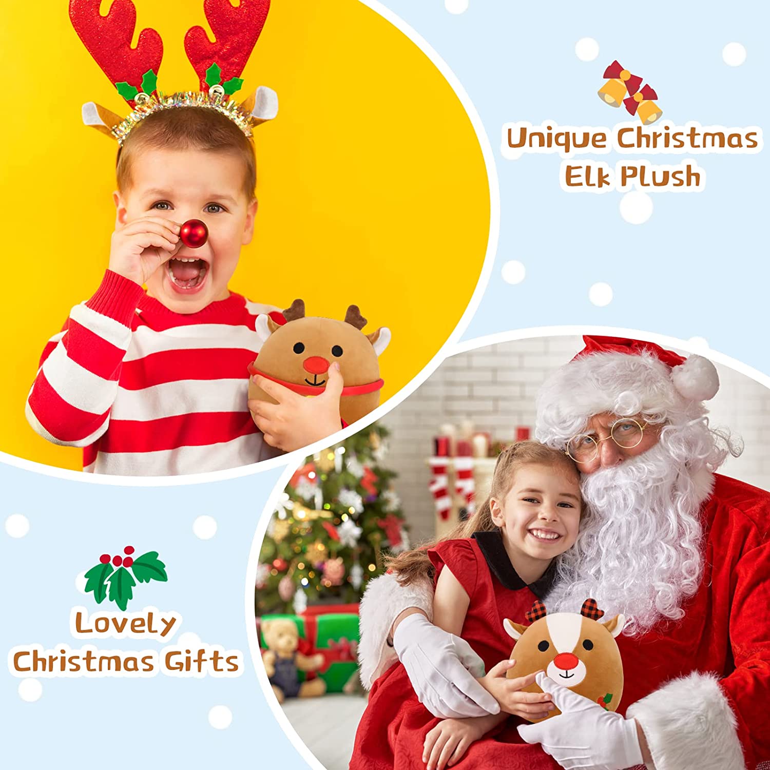 🦌 【Christmas Elk Plush Toy】: Our Christmas stuffed reindeer has a very soft body, a pair of cute antlers and ears, and a vivid and cute expression that makes you want to hug it! It has a small bell hanging on its body, very festive atmosphere, and it's probably looking forward to Christmas too!