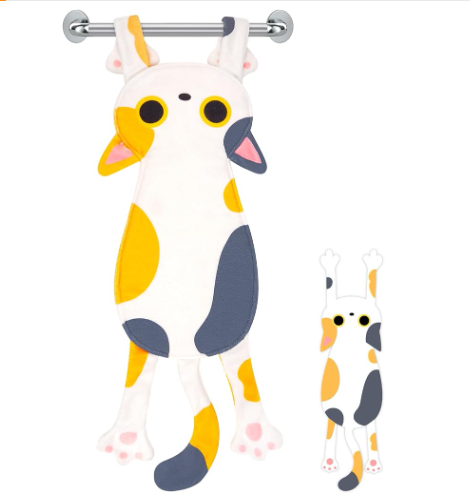 - Calico Cat Design: Our fun hand towels are shaped like elongated, playful cartoon calico cat to add vibrancy to your kitchen or bedroom decor. The calico cat hand comes with two convenient clasps that make it easy to hang on any pole and very practical