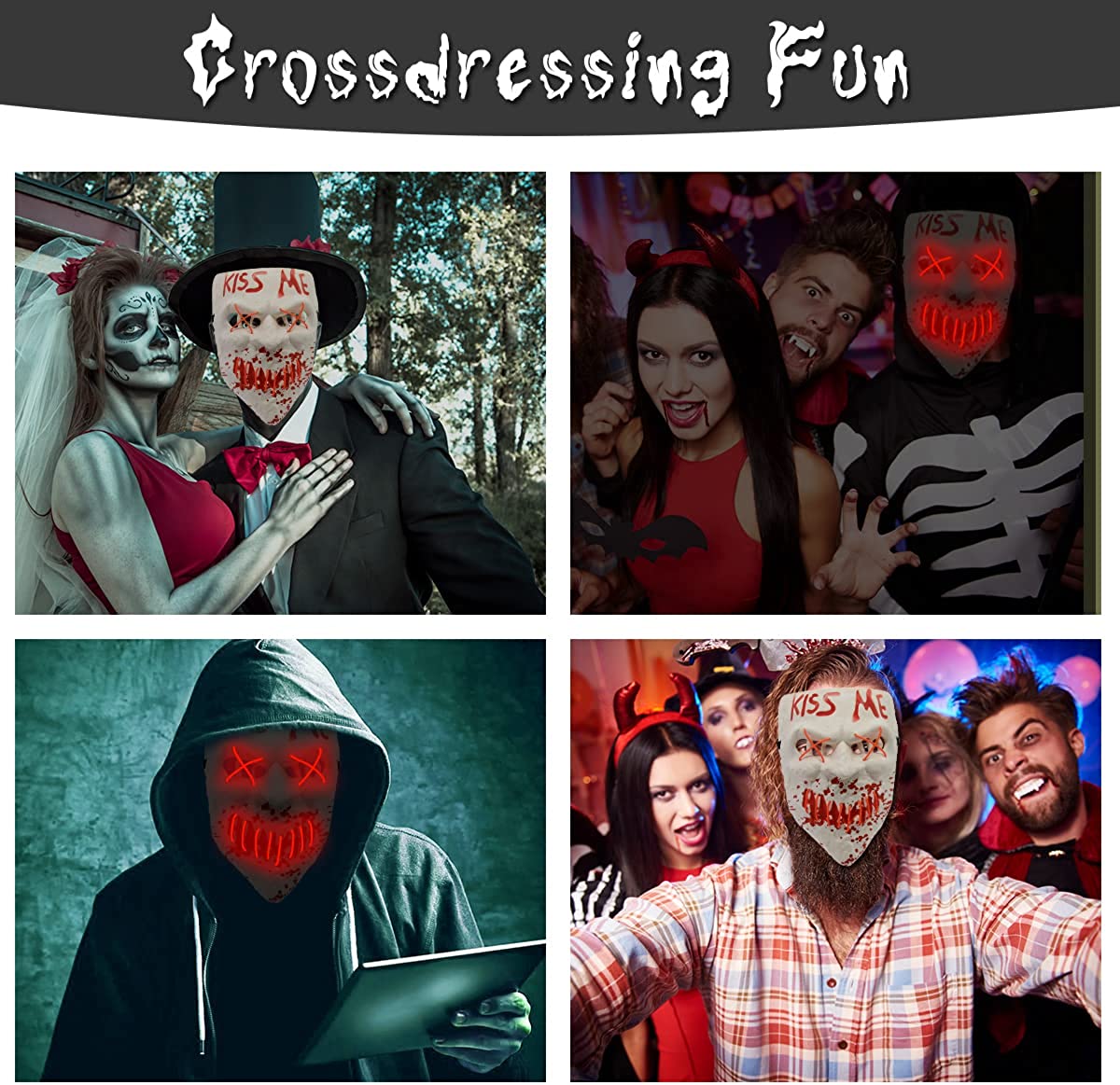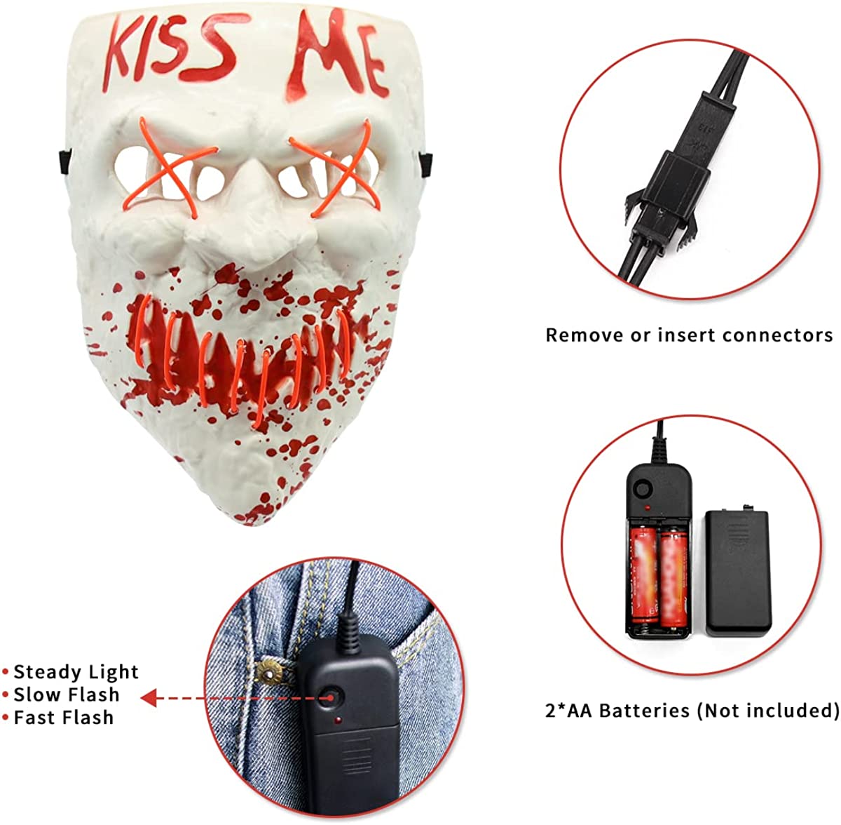 - 【PORTABLE MASK】: The controller of this Halloween glow mask comes with a clip, you can clip it to your pocket or clothes when you go out, adjust the light mode at will, it is very convenient to operate. It needs 2 AA batteries (Not included) to assist the neon mask to work.