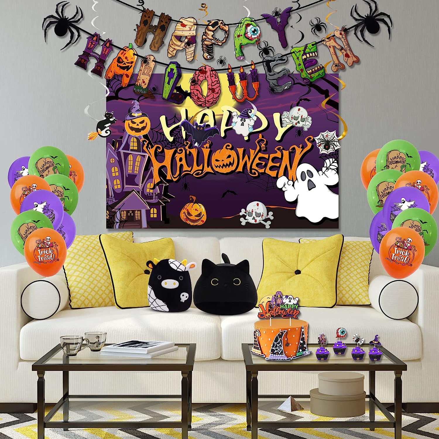Halloween Party Decorations, Halloween Themed Party Supplies with Happy Halloween Banner Balloons Spider Cake Toppers Swirl Streamers Party Backdrop for Halloween Birthday Indoor Set Halloween Decor