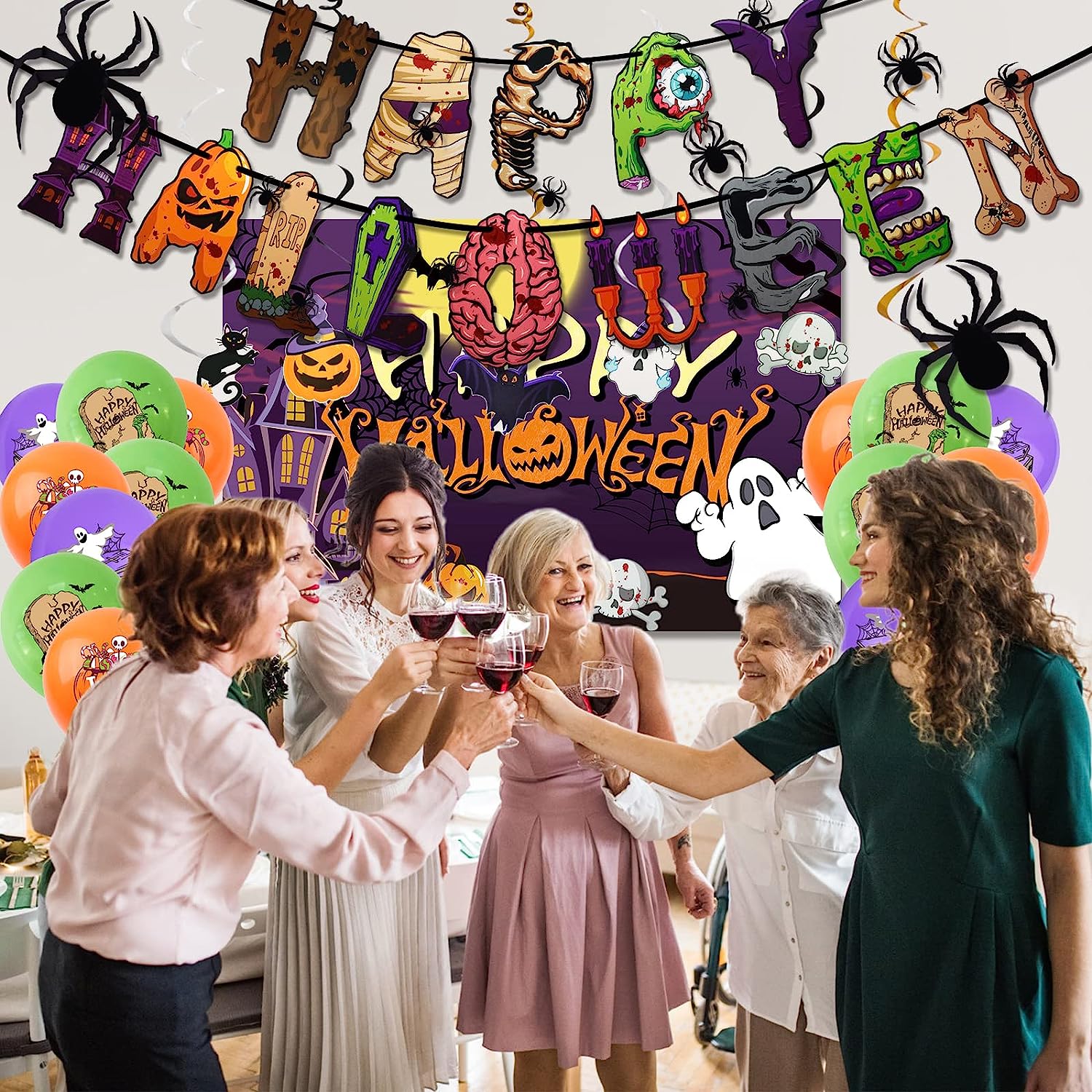 - 🎃【Halloween Party Decoration Kit】: 1 x HAPPY HALLOWEEN Banner,18 x Latex Balloons(6 x Green Balloon, 6 x Orange Balloon, 6 x Orange Balloon), 1x Party Backdrop, 6 x Hanging Decorative Card,6 × Hanging Swirl Ribbon,12 × 3D Spider,2 × Black Ribbon,16 x Cake Topper