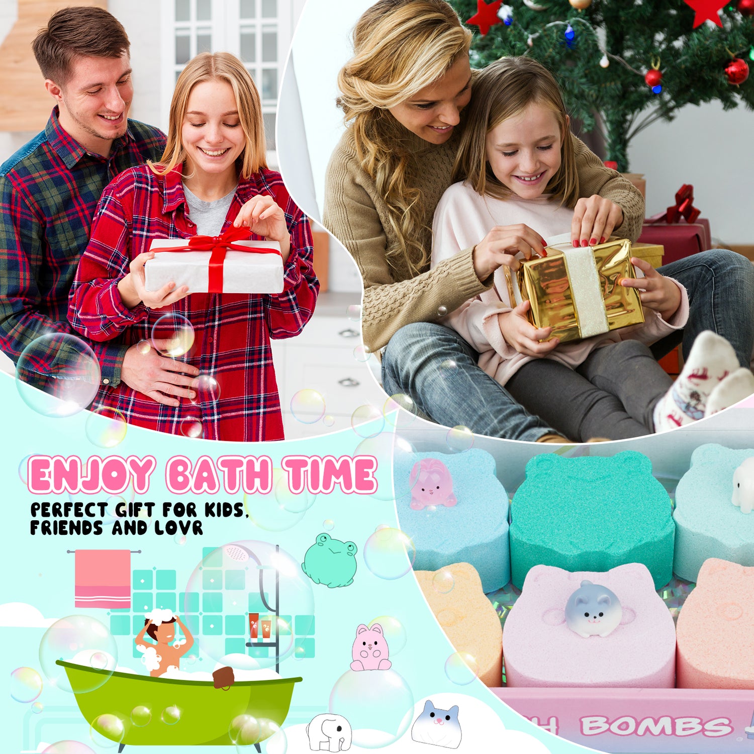 - Explore the bath time adventure with our Kids Bath Bomb Set! This delightful package includes 3 cat-shaped bath bombs, 3 frog-shaped bath bombs, and 3 playful animal toys inside. Each bath bombs with toys inside, containing a sparkling gemstone. Sink into a luxurious bath and watch as the water reveals these hidden gems!