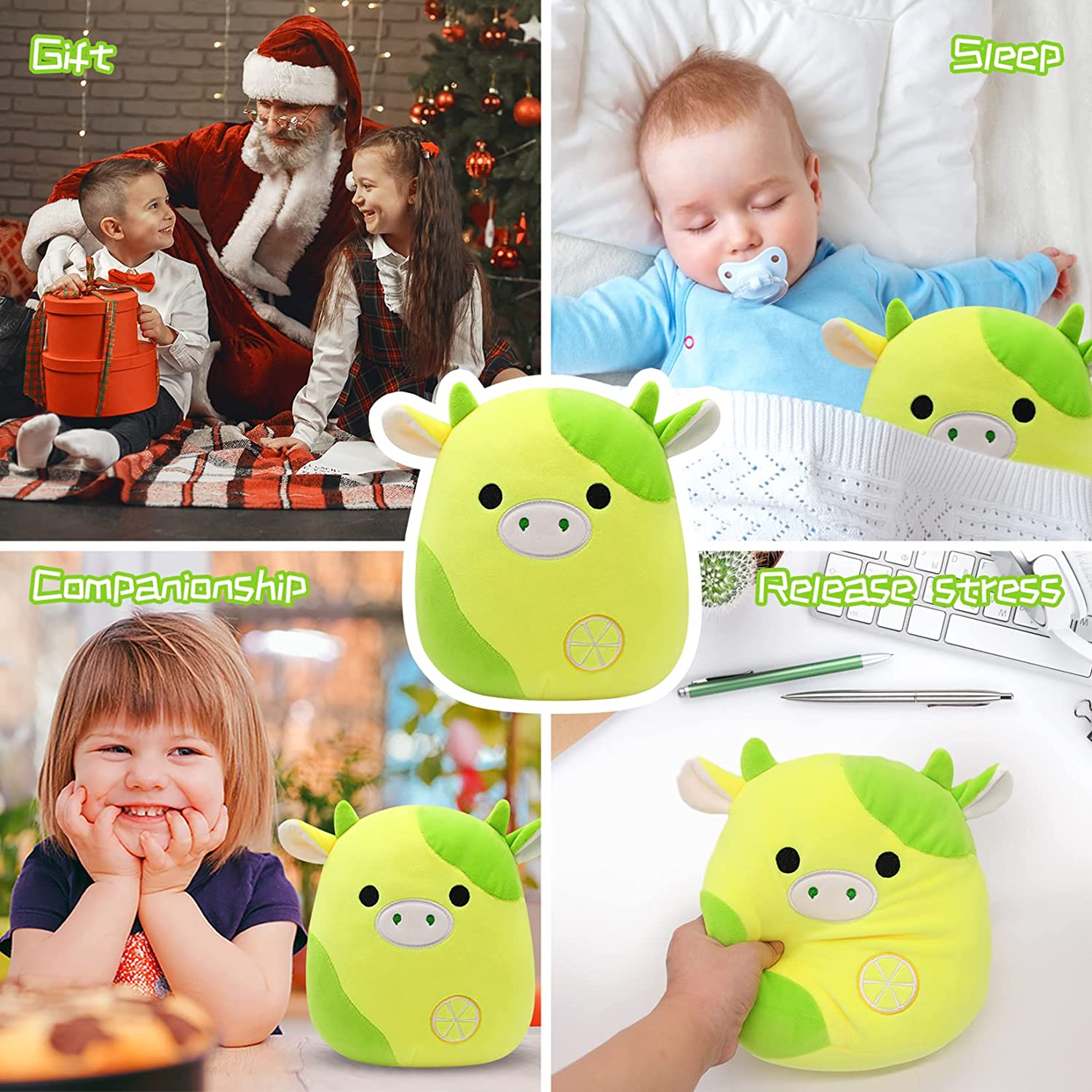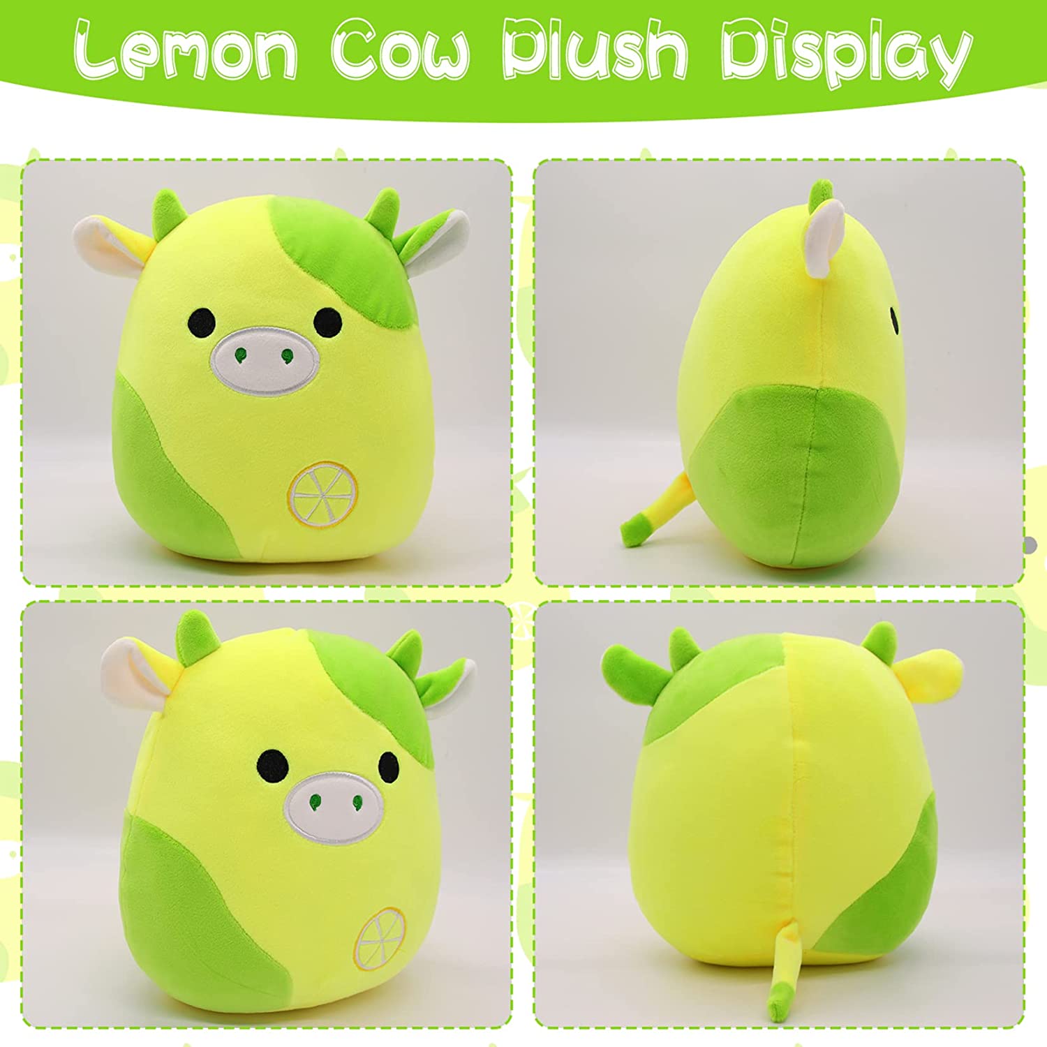 - 【Lemon Cow Plush】Cute cow shape design, there are a pair of cute calf horns and a pair of small ears, below are round eyes and Kawaii mouth, the bottom is yellow lemon, soft and comfortable materials will let your child fall into love with it.