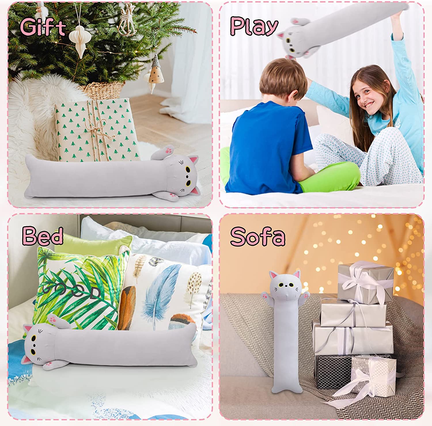 【Cute Cat Gift】: A cute gray cat hug pillow that everyone can't refuse because it's really cute and soft! You can name the adorable gray cat plush toy and make it your most loyal companion! Kawaii plush cat toy can be used as Christmas, birthday, Halloween and other holiday gifts for kids, family or friends, it will bring good luck to your family and friends!