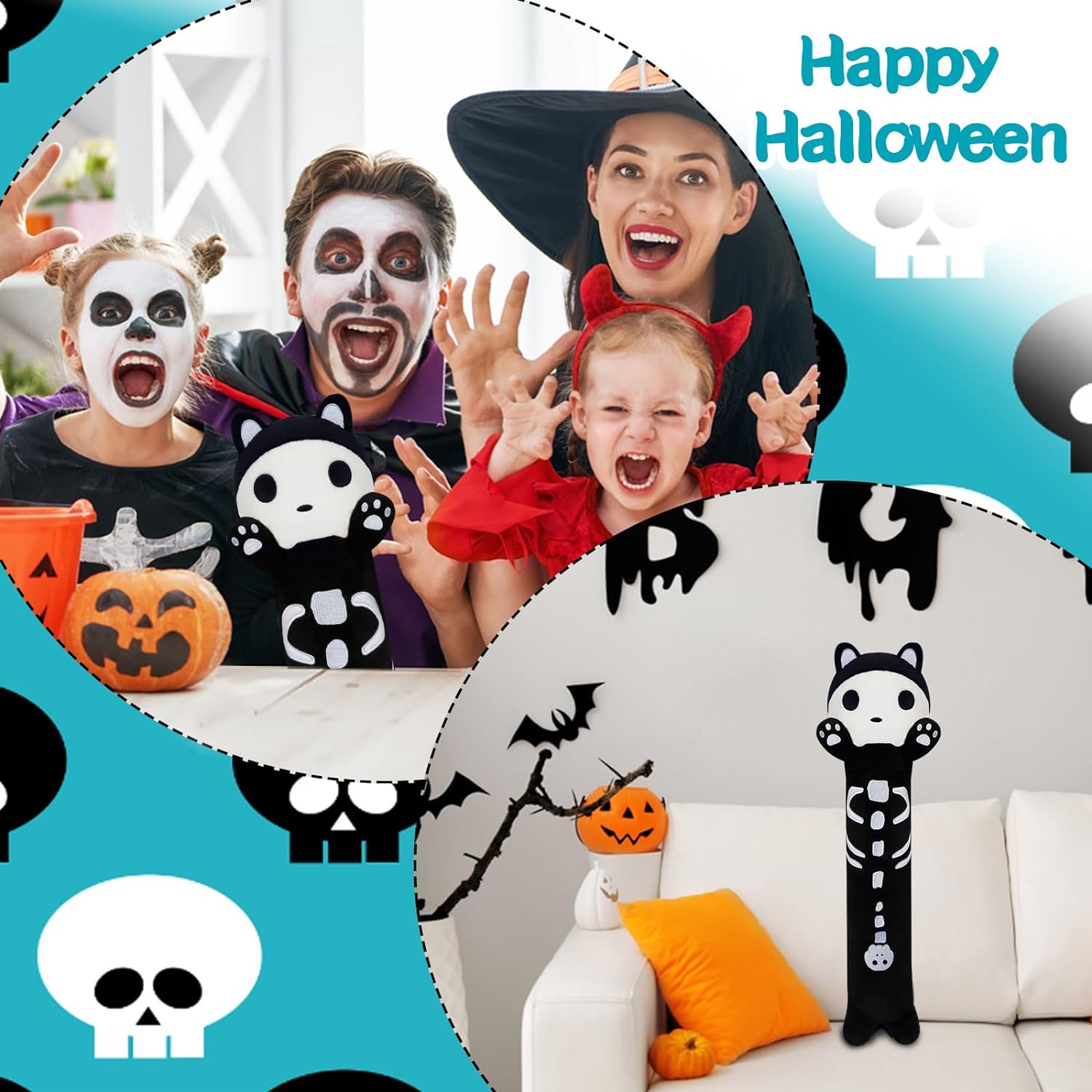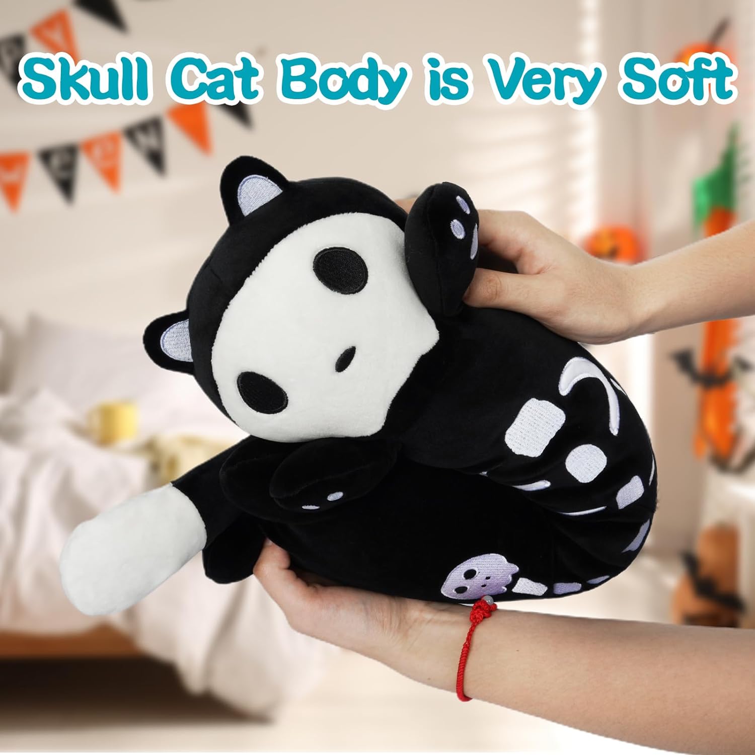 - 【Creative Long Cat Plush Toy】: Great gift for Halloween glitter! The combination of black cat body and skull head looks scary and cute! No one can say no to this special multi-skull cat.