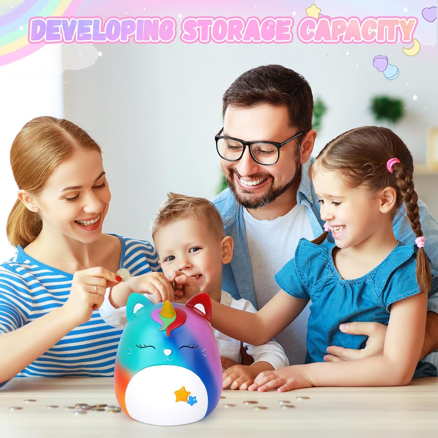 - Easy Money Access: The unbreakable piggy bank features a convenient rubber stopper at the bottom, allowing easy access to the saved funds without having to break the coin bank. Exquisite Gifts: Our colorful unicorn piggy bank toy is colorful. The money jar Unicorn banks is kids bank and a practical gift for children's birthday, Christmas, Easter,other festivals. Give your child a gift of joy, learning and saving