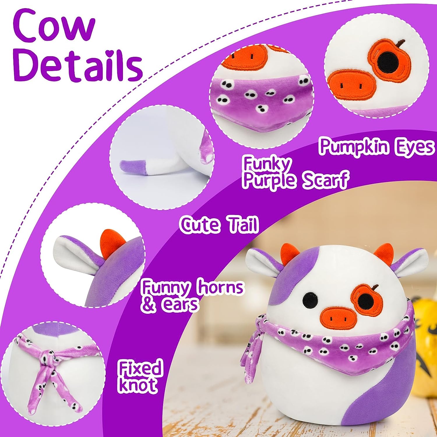 - 🎃Halloween Cow Plush:The cute cow finger doll toys has an orange pumpkin eye and a purple scarf decor with lots of Halloween elements,perfect for decorating your home on Halloween and creating a Halloween day atmosphere