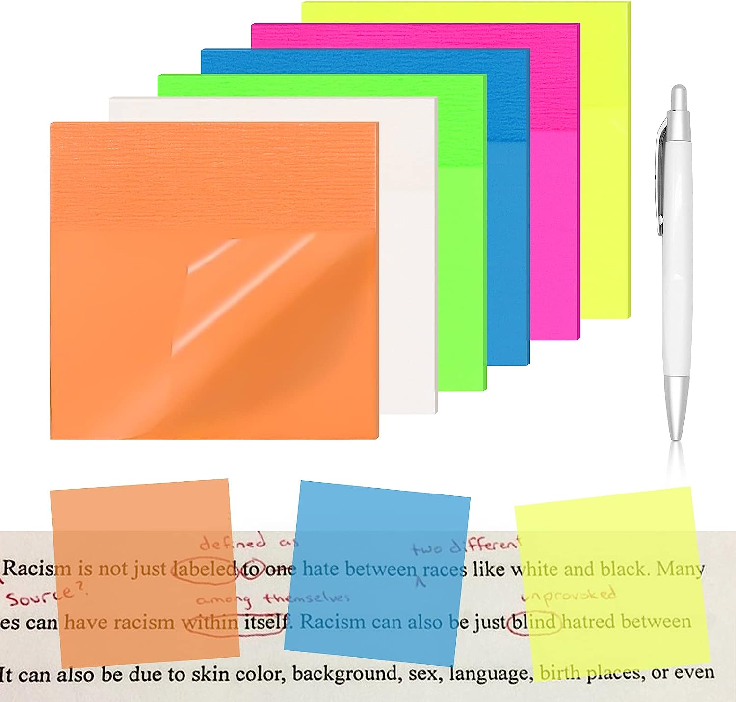 Package Content: You will receive 12 packs of transparent sticky notes (3 x 3 inches), 50pcs per pack, 6 colors in total, as well as 1 ballpoint pen, sufficient quantity and a variety of colors for you to choose and match, which can meet your daily use and replacement needs.