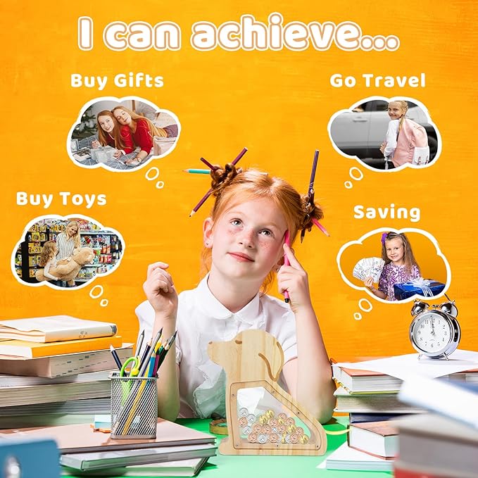- Money Bank Education Toy: Combine education with pleasure, cultivate the habit of saving money. Our wooden piggy bank with a suitable opening for both cash and coins, The clear acrylic lets you see the saving process and gives you a feeling of accomplishment when it's fulled. Unscrew the screw if you need to take out the money.